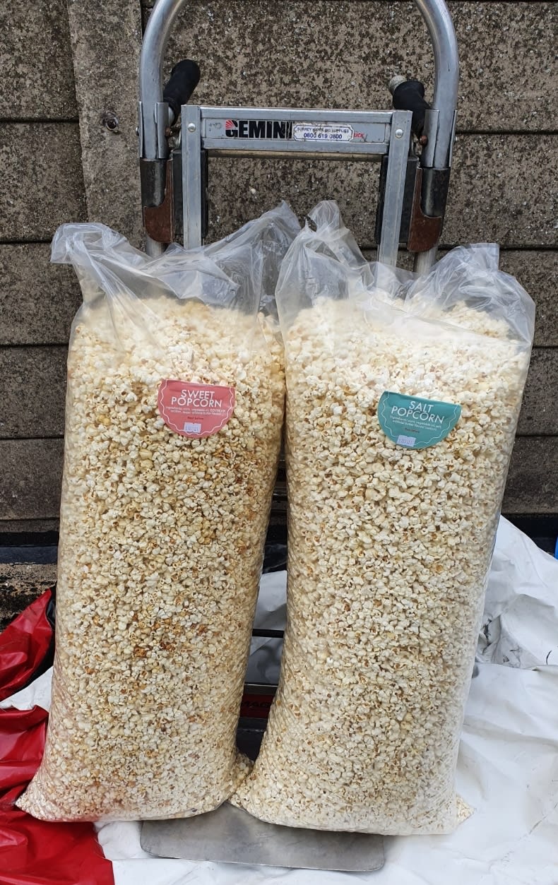 1 x big bag of ready made Popcorn at a extra cost of £20. Choice of sweet or salty.