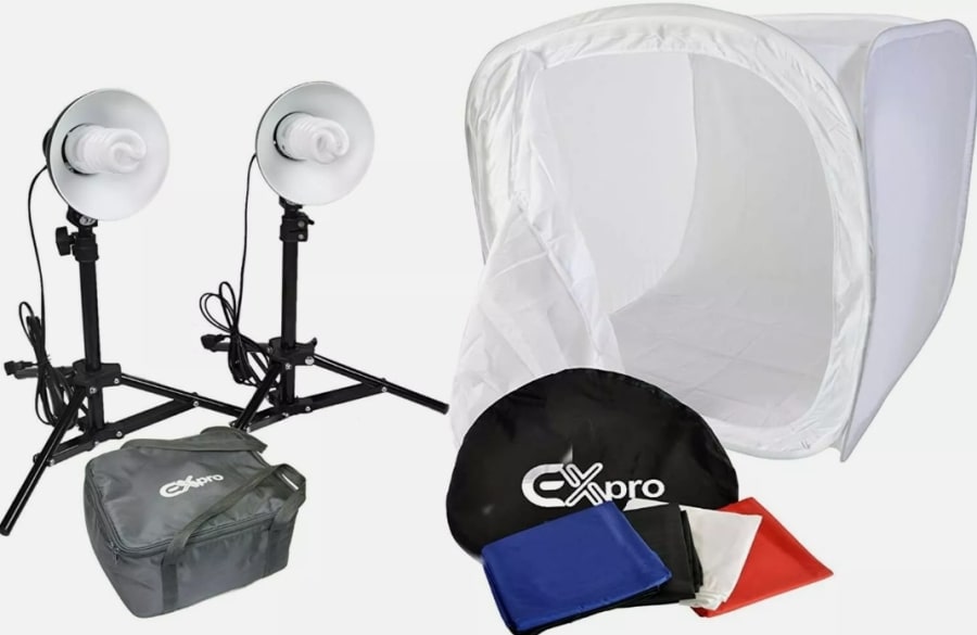 Excellent for field job. Includes lighting kit carry case, keeps all the lighting kit together, light tent has it's own zip case creating a ready to go studio giving your products a new lease of life. In response to the ever changing photographic market and DIY photographic requirements for site/business owners Ex-Pro Lighting kits offer excellent quality and added value for money. Includes high quality carry case containing all the lighting equipment.