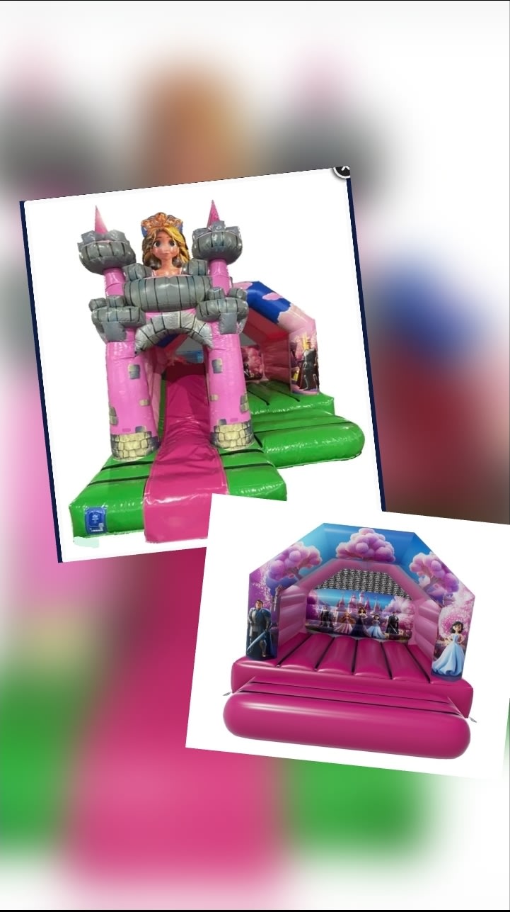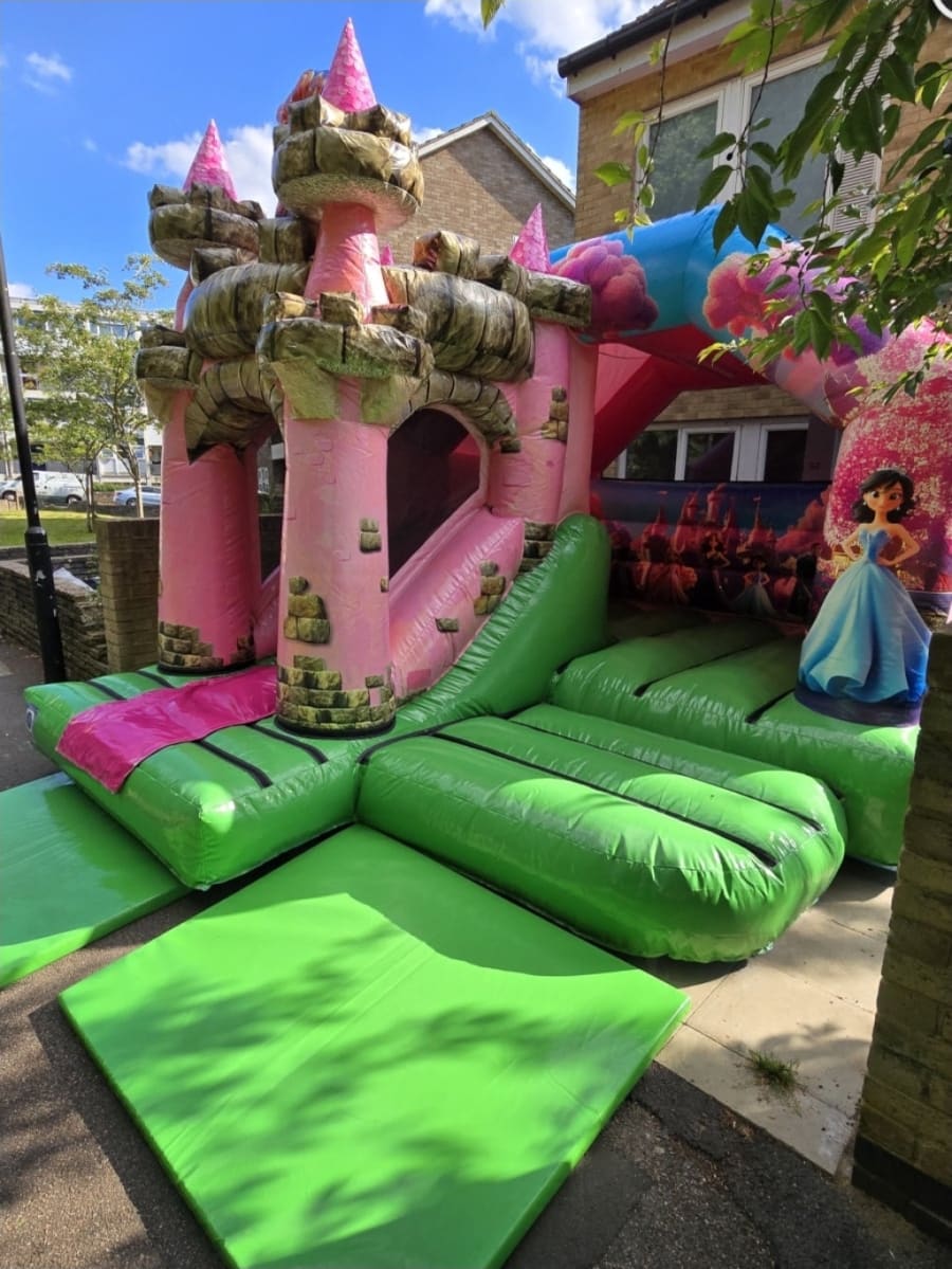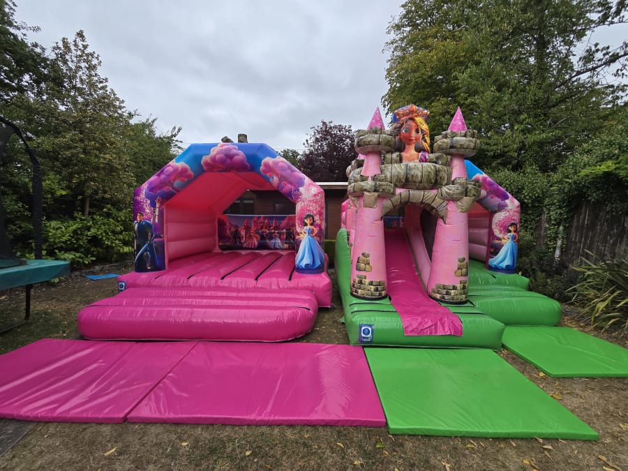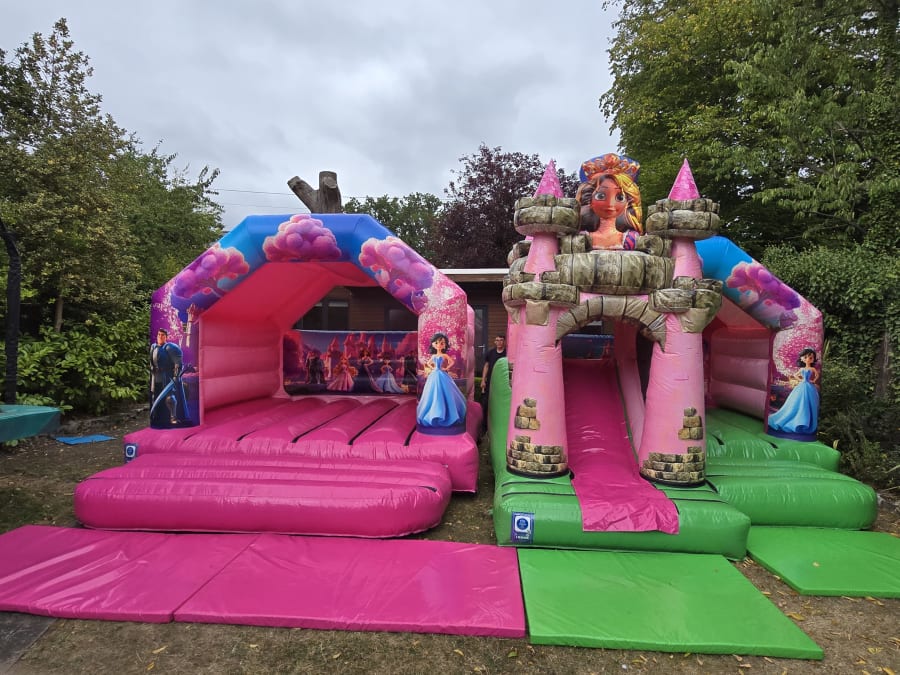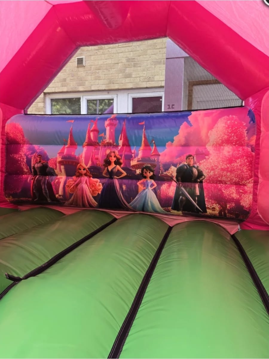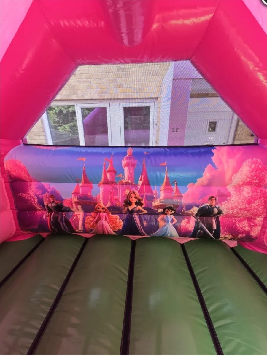 The 3D Princess Bouncy and Slide Combi is 15ft deep x 12ft wide, and a matching Princess Bouncy Castle is 15ft x 12ft.