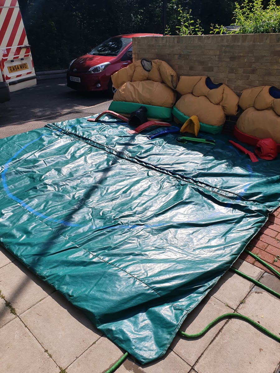 Please note the Green wrestling mat is 11ft x 11ft Square and the Red round wrestling mate is 11ft x 11ft round. When hiring these Sumo Suits you will get one of the two wrestling mats that is available on the day.