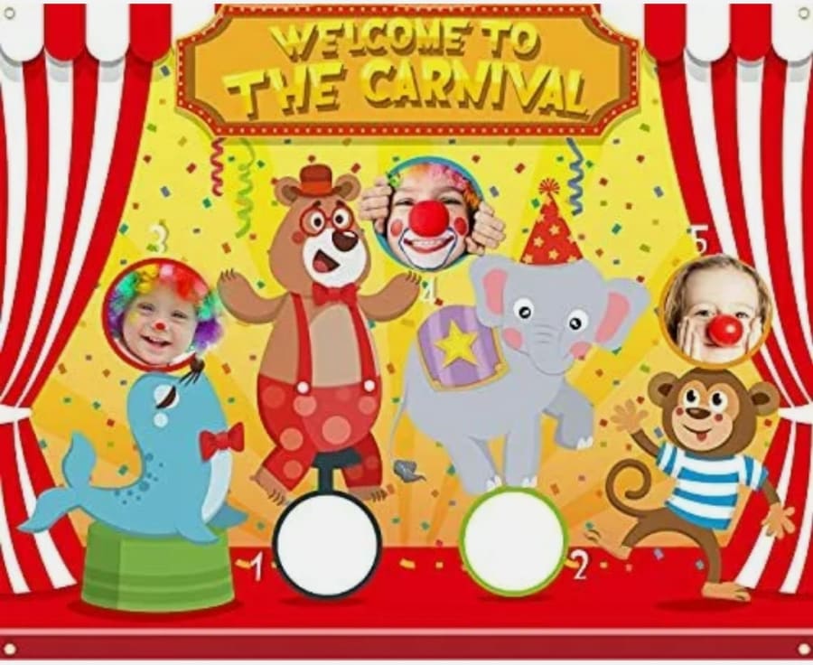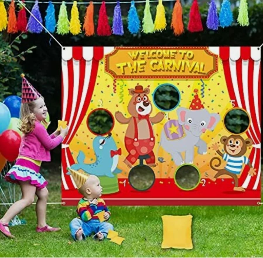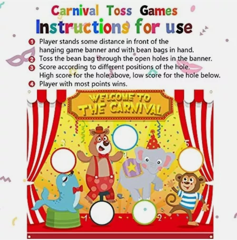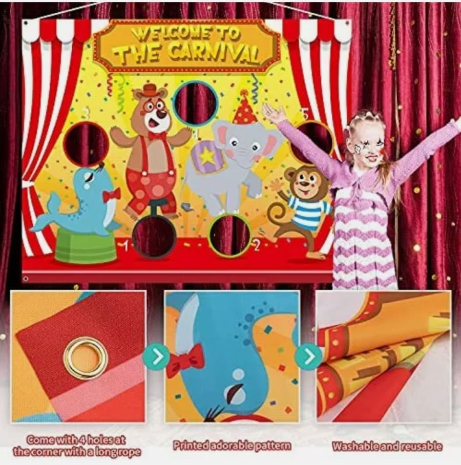 Circus themed carnival toss game banner with 4 bean bags, larger size than traditional toss game banner, suitable for both kids, adults and multi-team competition, adding more fun to the carnival party.
