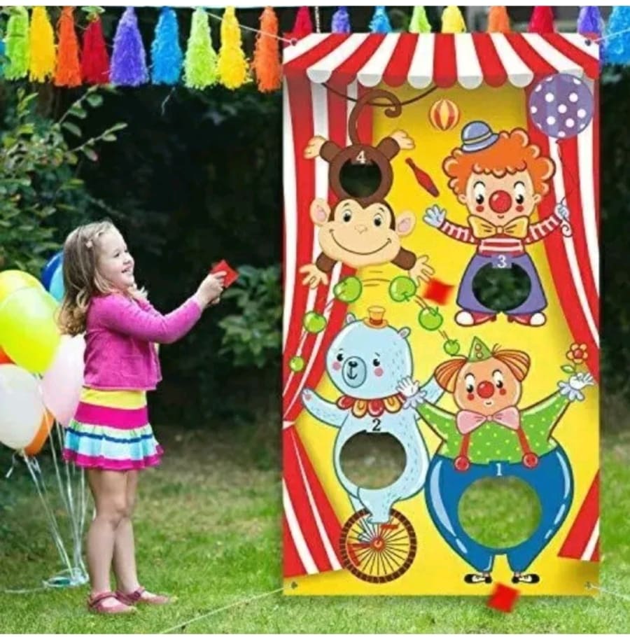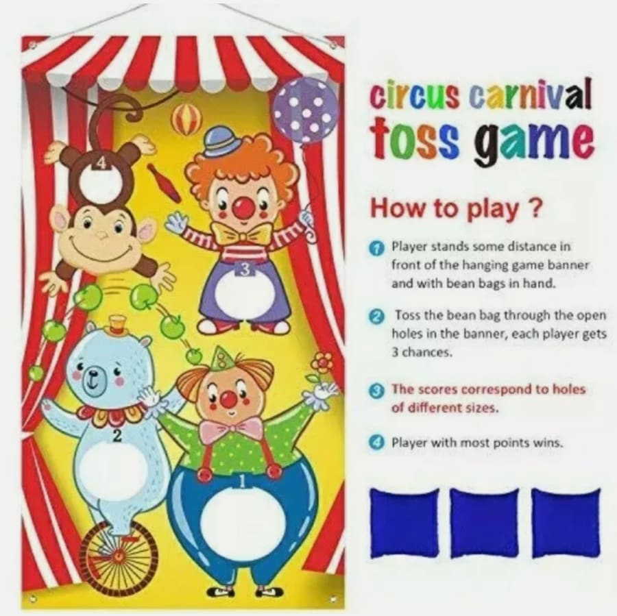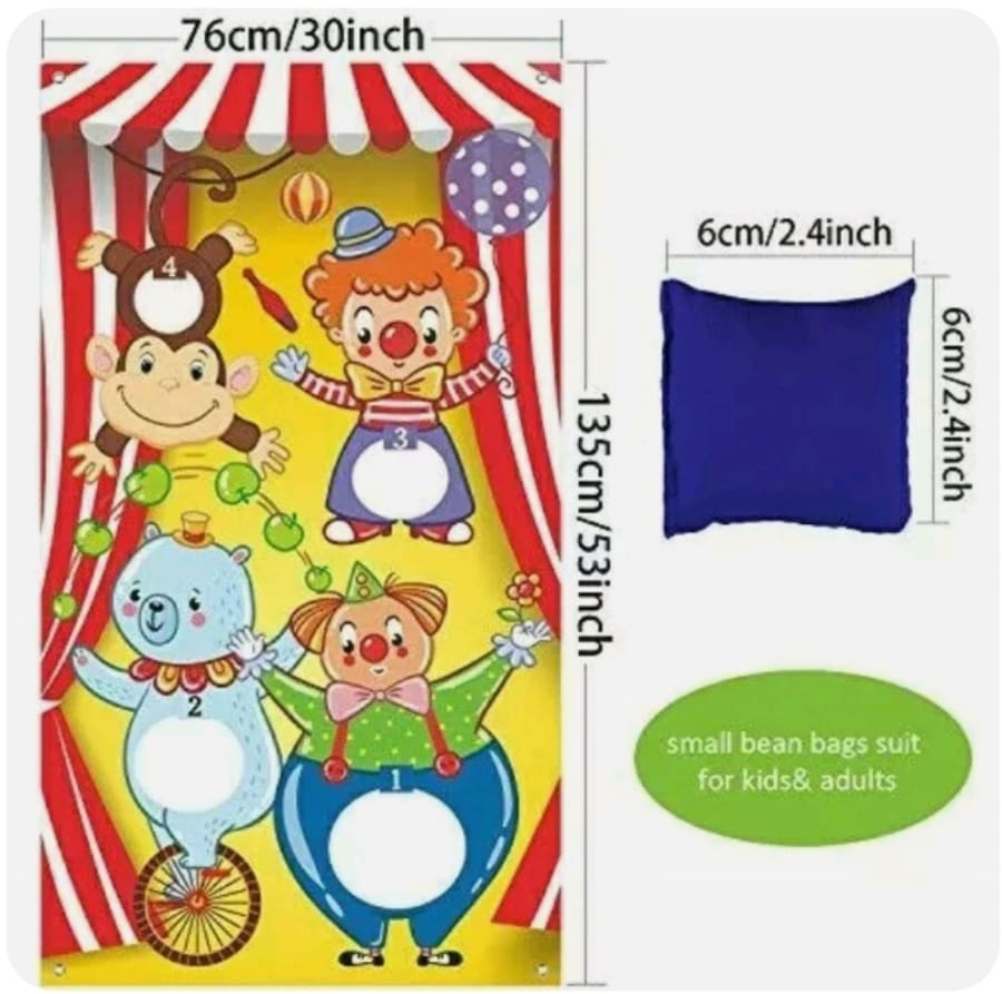 Carnival toss games clown banner with 3 bean bags circus bean bag toss game for carnival party activities, great carnival decorations, circus suppliers for kids and s Features: 1. Cute design toss game: this carnival toss game is printed with cute clowns and balloons, give the toss game banner full of carnival feeling. 2. Funny Carnival party game supply: add more memory at your carnival party, add fun for home, school, backyard, beach or wherever you might be traveling. 3. Washable and reusable: made of quality fabric, convenient to store and carrying. 4. Great carnival party decoration: suit for decorating indoor or outdoor, like Carnival party, summer party, family friendly party, group activity and so on. How to use: 1. Player stands some distance in front of the hanging game banner and with bean bags in hand. 2. Toss the bean bag through the open holes in the banner, each player gets 3 chances. 3. The scores correspond to holes of different sizes. 4. Player with most points wins. Package includes: 1 x Fabric carnival toss game banner (30 x 53 inch) 3 x Bean bags (2.75 x 3.15 inch) 1 x Ribbon (approx. 9.8 feet ) Attention: Due to the problem of packaging, there may be creases that can be ironed on the back of the product.