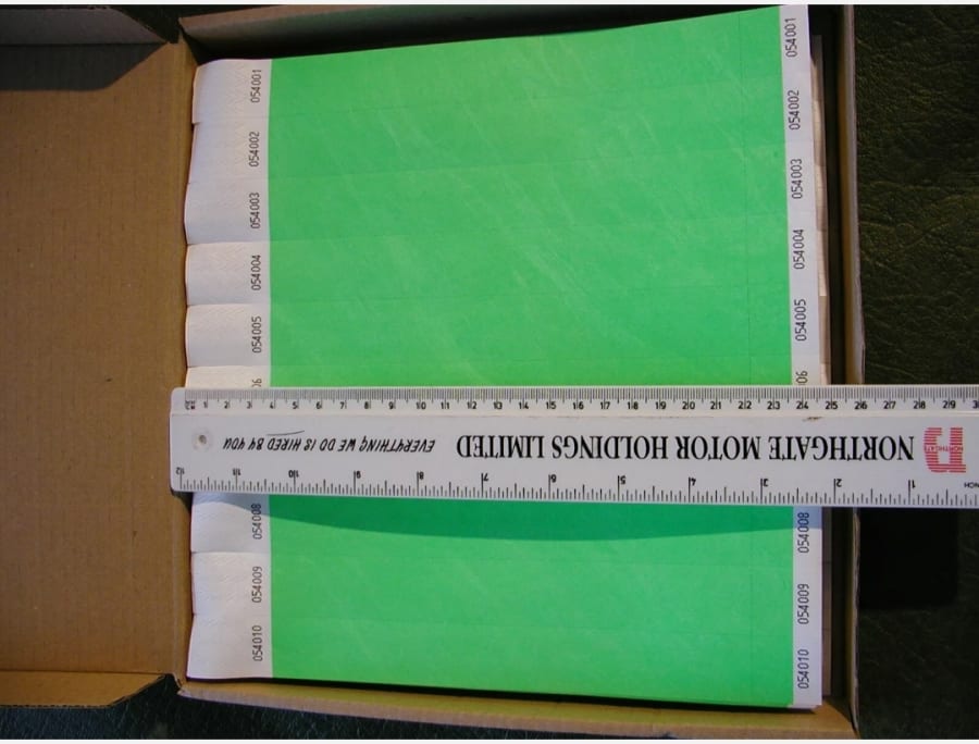 These are available in packs of 100 wristbands.