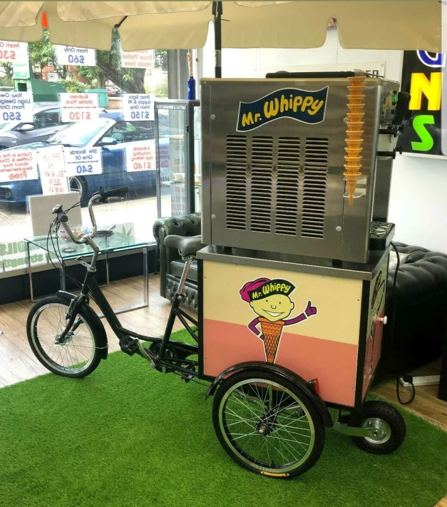 Can be icecream machine, Slush machine, Popcorn machine, Candyfloss machine, Hot dog machines, sweet cart, Champagne with Glasses, Pimms O'clock and more. Just ask and we will put it on the Trike.