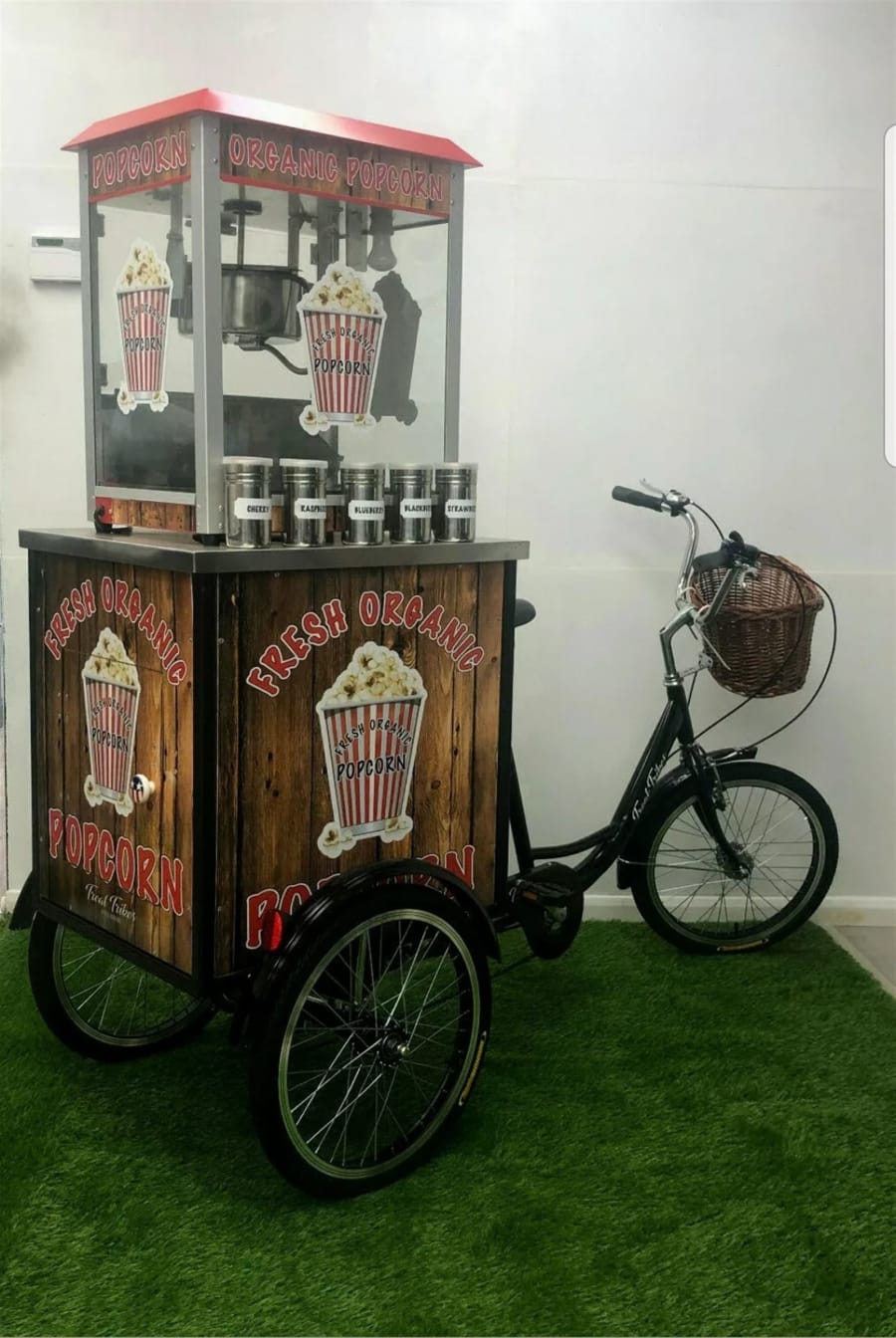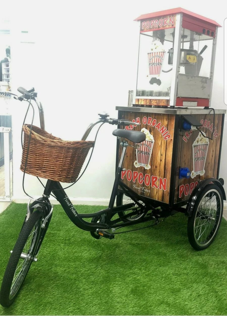 Can be icecream machine, Slush machine, Popcorn machine, Candyfloss machine, Hot dog machines, sweet cart, Champagne with Glasses, Pimms O'clock and more. Just ask and we will put it on the Trike.