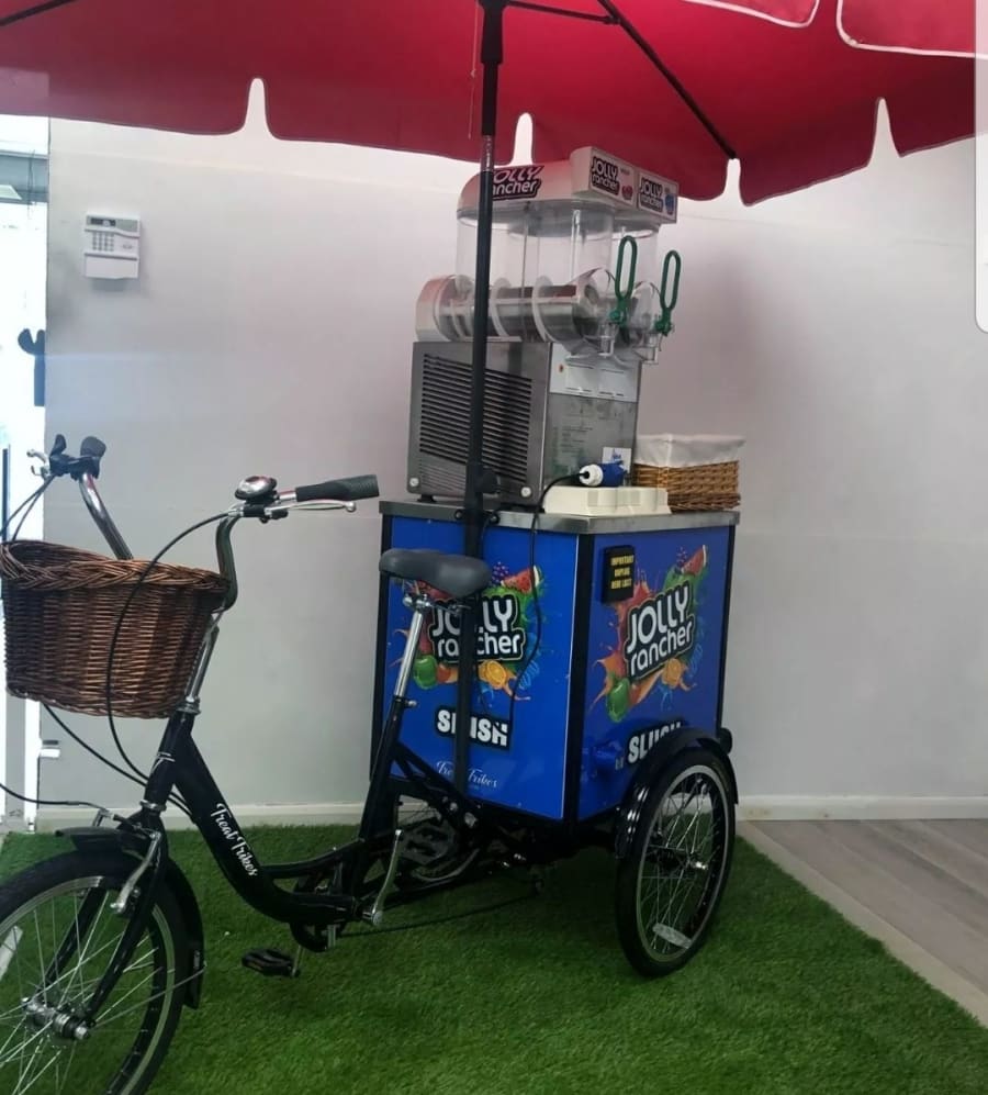 Can be icecream machine, Slush machine, Popcorn machine, Candyfloss machine, Hot dog machines, sweet cart, Champagne with Glasses, Pimms O'clock and more. Just ask and we will put it on the Trike.