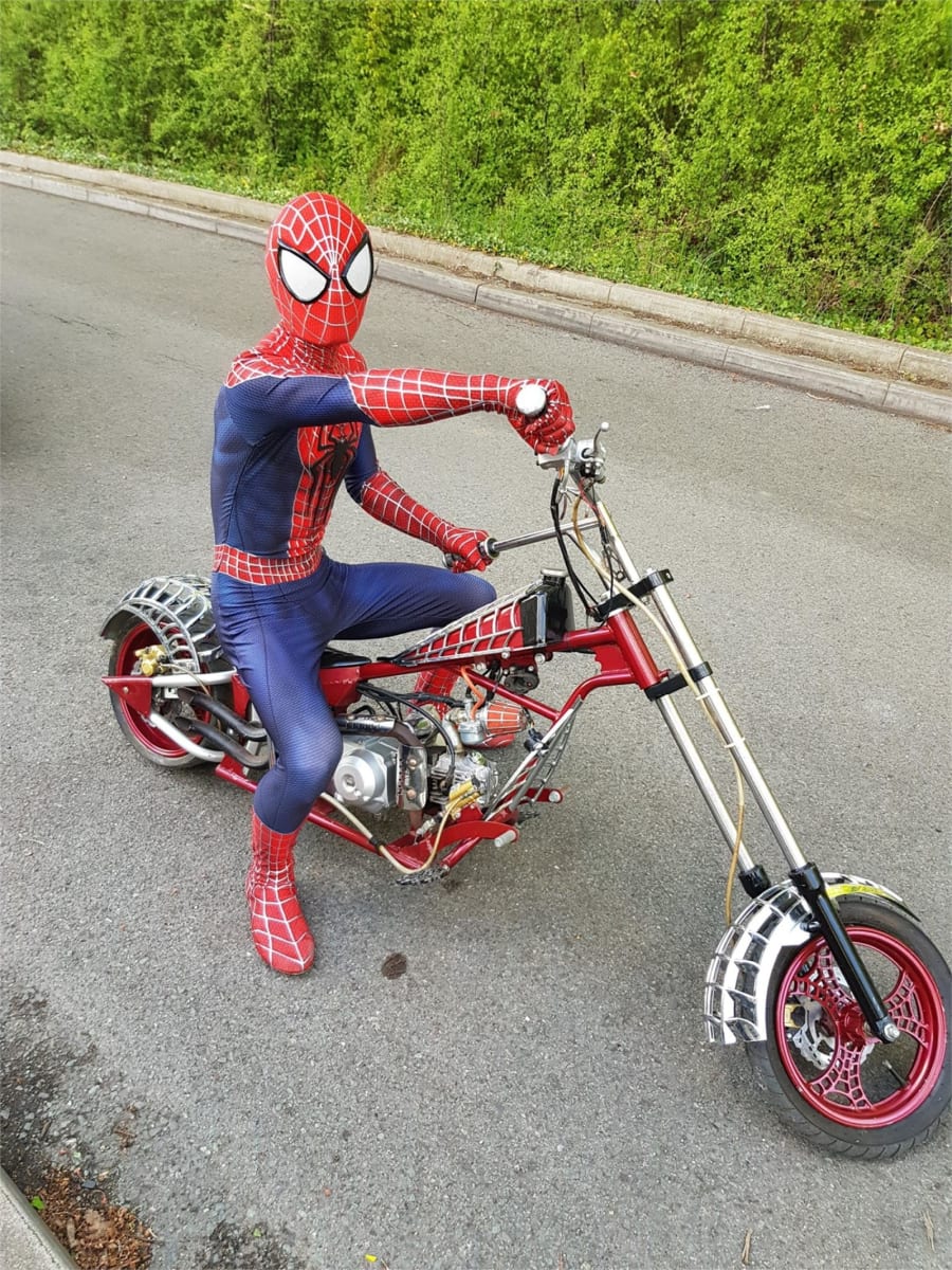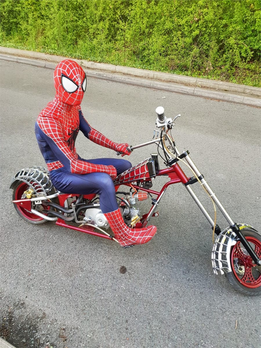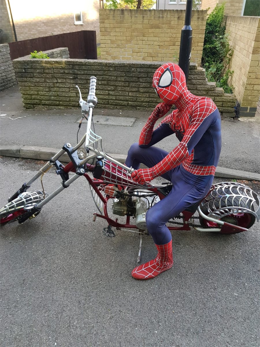 Due to health and safety regulations Spiderman no longer rides the bike or has the engine running and does not have fuel in its petrol tank at your events or private parties. This is now just for show and photo shots with children sitting on the bike with Spiderman by there side.
