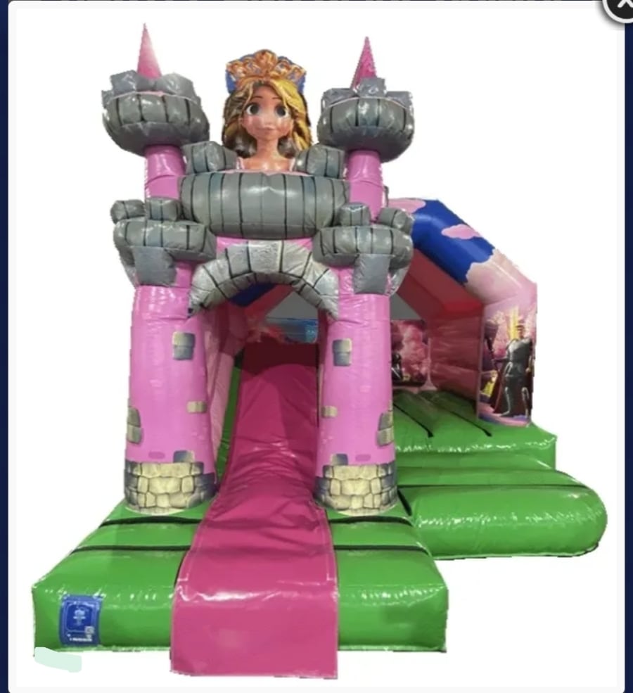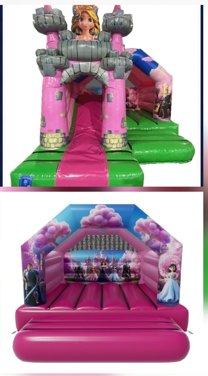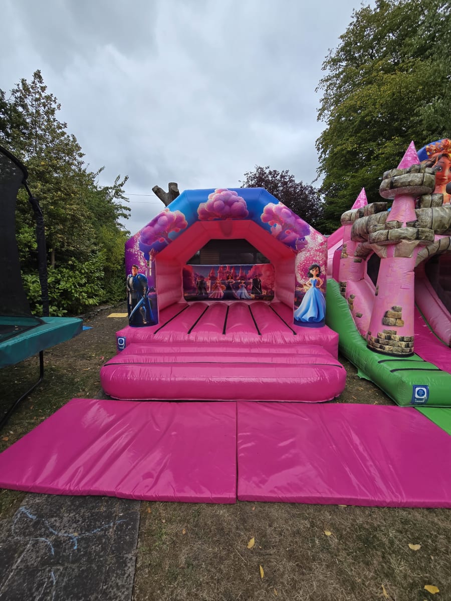The 3D Princess Bouncy and Slide Combi is 15ft deep x 12ft wide, and a matching Princess Bouncy Castle is 15ft x 12ft.