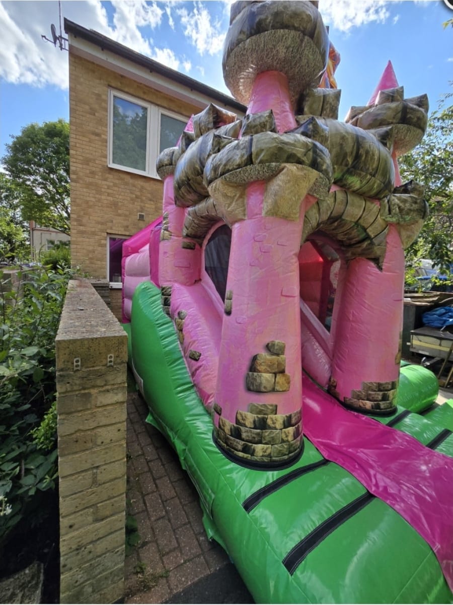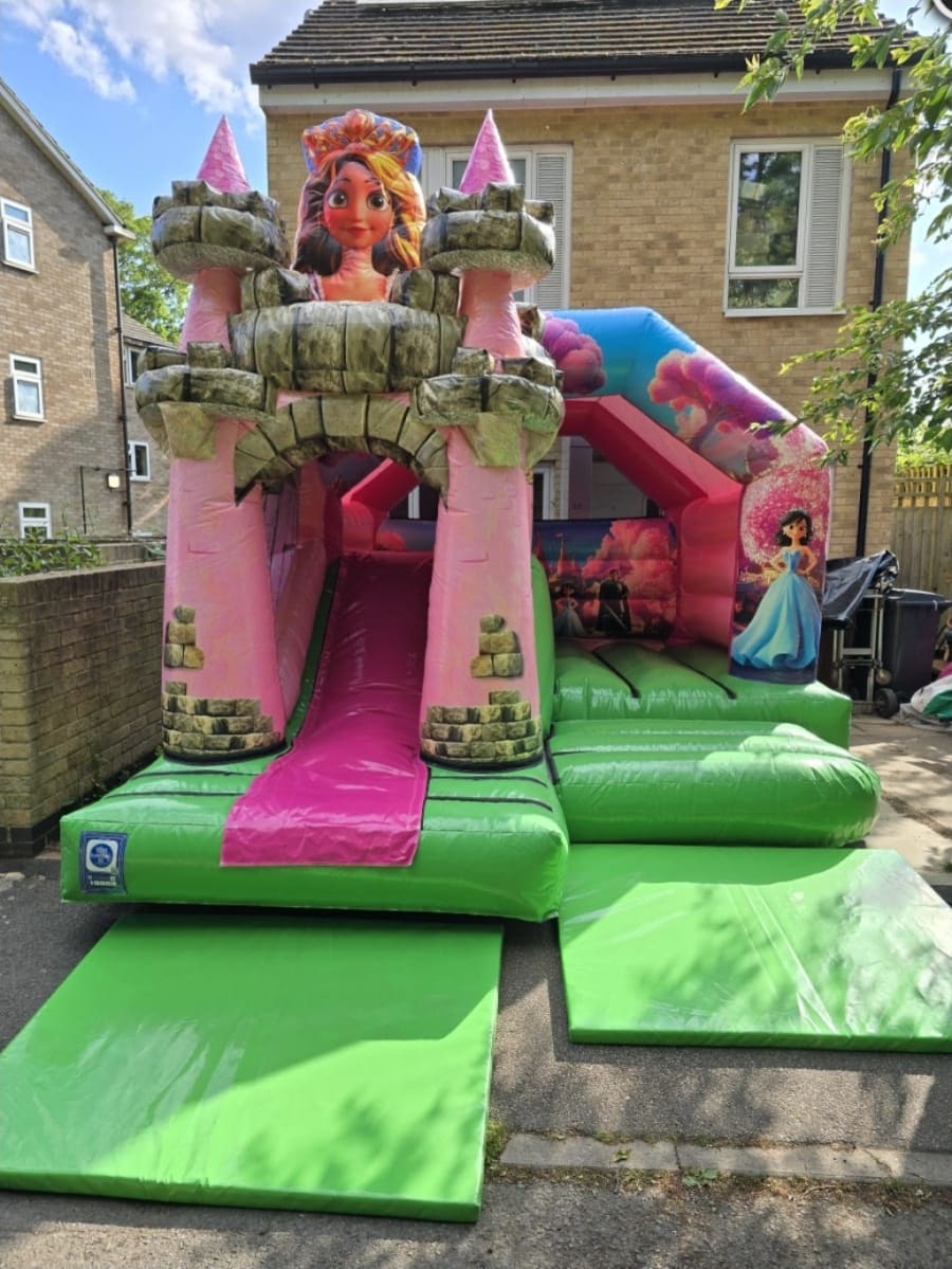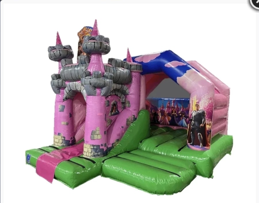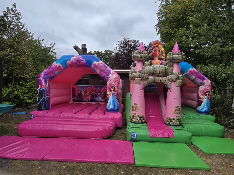 The 3D Princess Bouncy and Slide Combi is 15ft deep x 12ft wide, and a matching Princess Bouncy Castle is 15ft x 12ft.