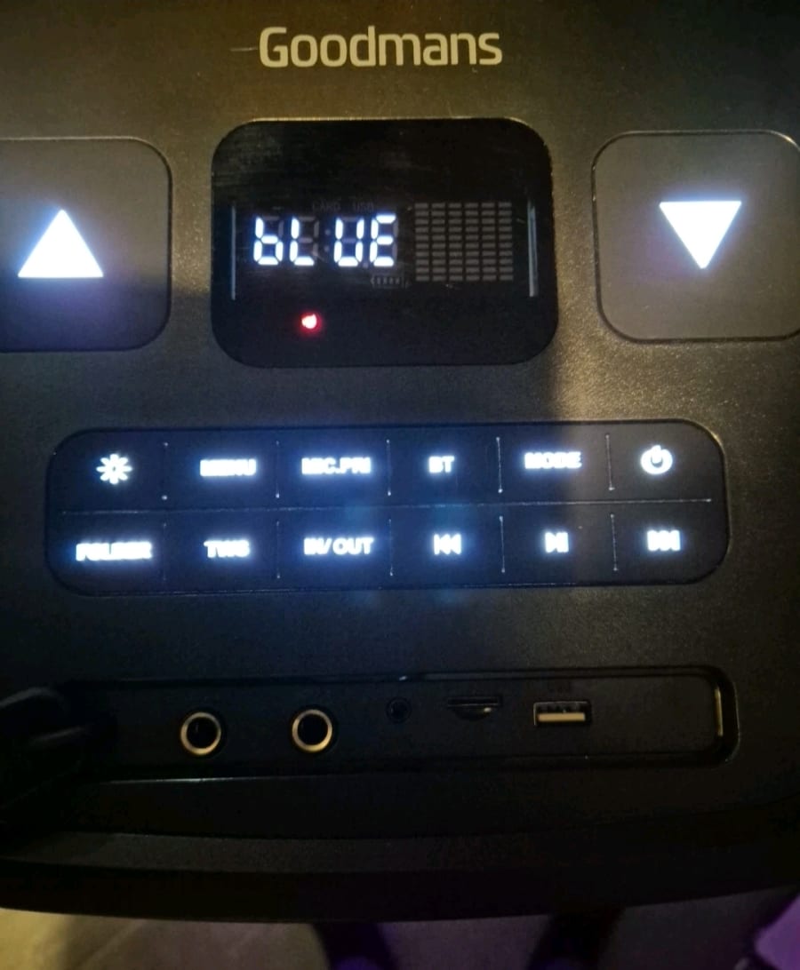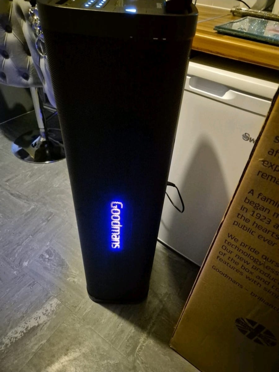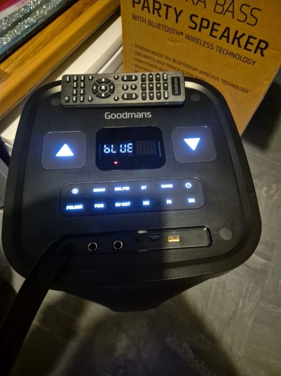 The Goodmans 100W RMS Extra Bass Party Speaker is a rectangular-shaped speaker with a sleek black design. It features 2.0 channel Dolby Digital surround sound, perfect for creating an immersive audio experience. This large party speaker is equipped with Bluetooth connectivity, a remote control, and a USB port for added convenience. With a 100W RMS power output, this speaker delivers high-end sound quality for all your party needs. The Goodmans XL Extra Bass Party Speaker is a top-of-the-line unit that is sure to impress your guests with its impressive sound performance and advanced features and impressive 200W Max Power.