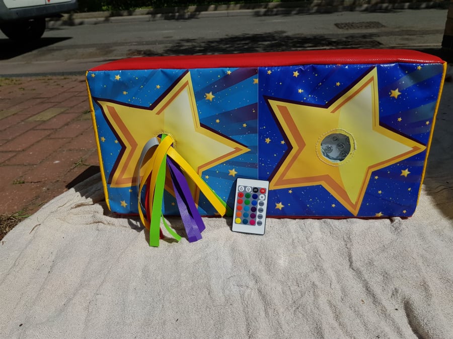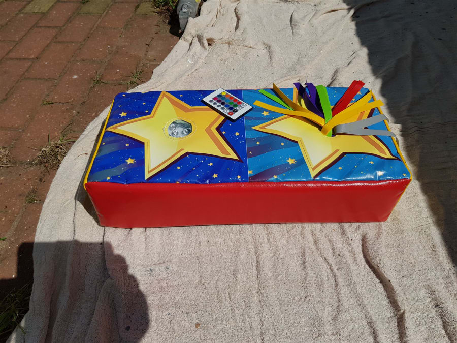 One side has colourful tassels and the other side has a fully remote control colour changing light. Check out our other Sensory soft play items for hire.