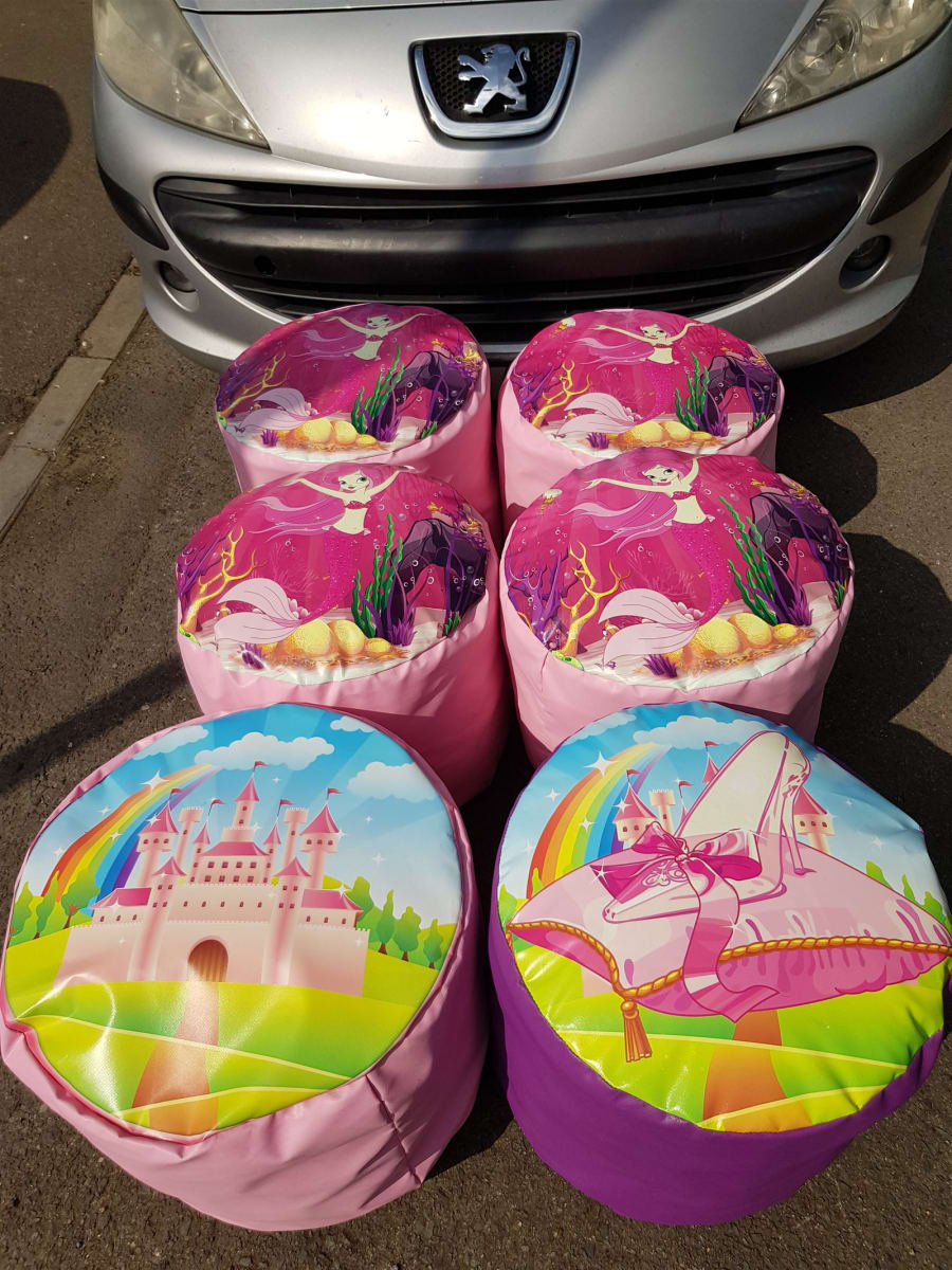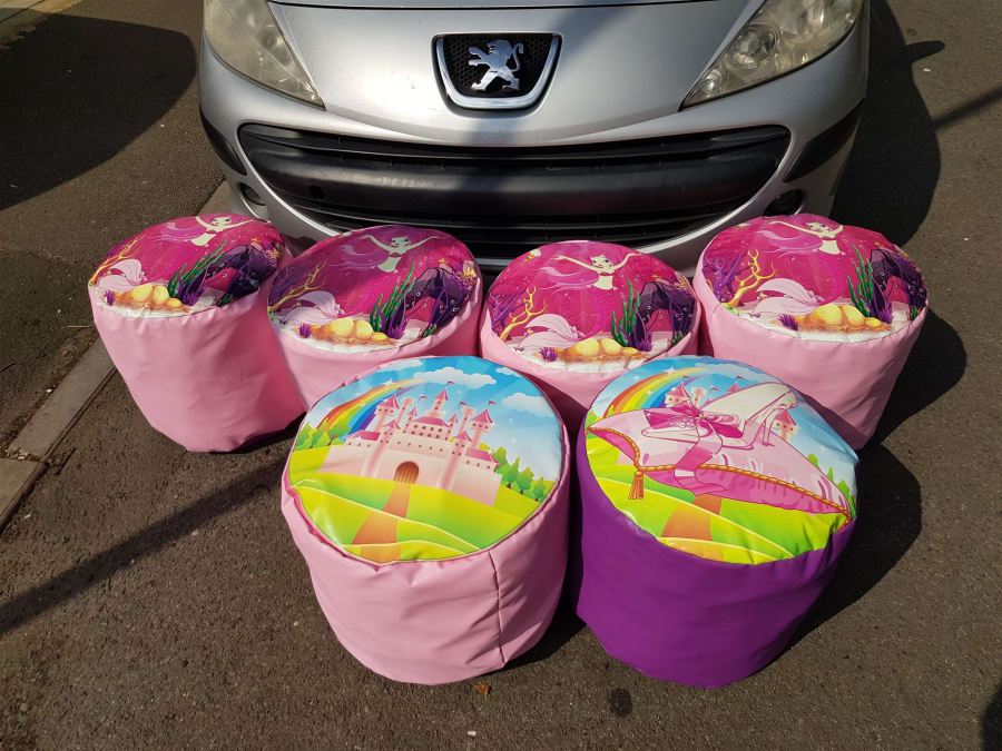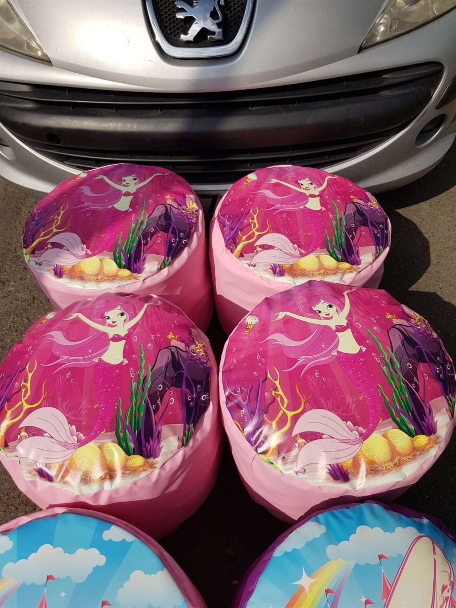 Bouncing Bonkers London welcomes our new Pouffe's. Something for the Girls. Two Princess Pouffe's , and Four Marmaid Pouffe's.