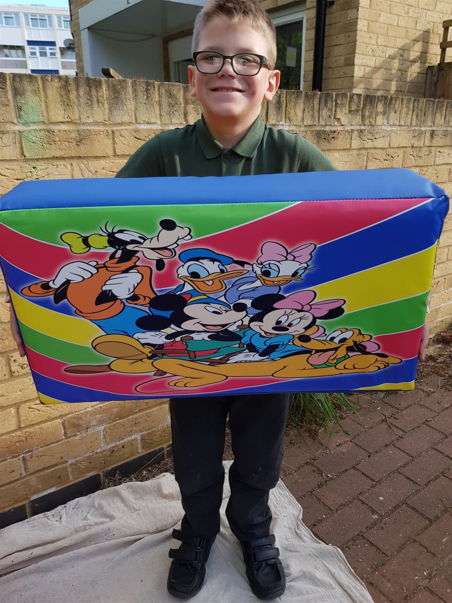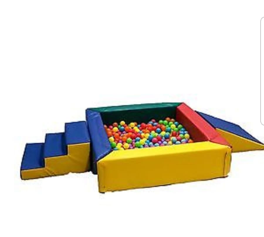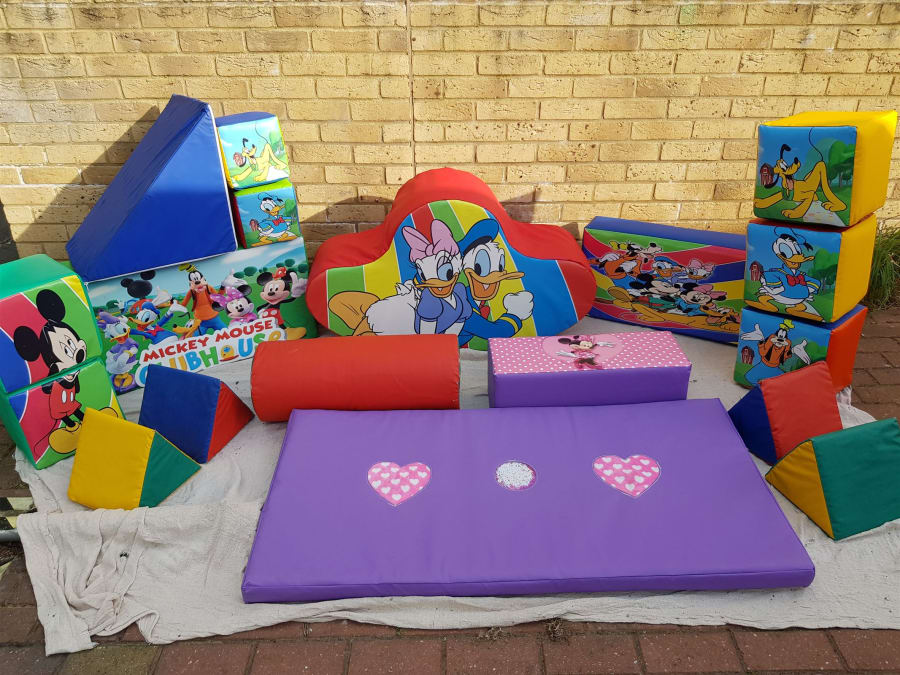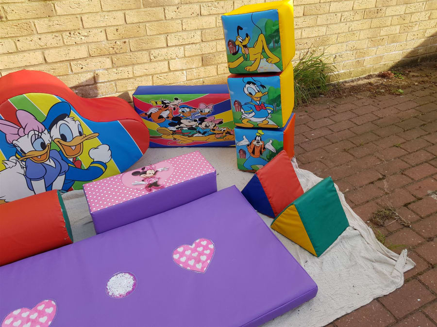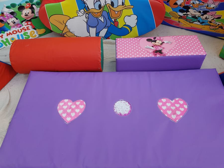 Bouncing Bonkers have this Fantastic Deluxe 21 pcs Soft Play and Ball Pool with steps and slide set available for hire. There are some very big Soft play shapes in this set. 1 x Large Double Seesaw. 1 x large ultra Soft Blue Triangle. 1 x large Barrel. 4 x smaller Triangles. 3 x Large Cubes. 2 x Smaller Cubes. 3 x Large Mickey Mouse Club House Soft Play Blocks. 1 x big 2pcs Mickey Mouse Puzzle. 1 x soft play Purple Hearts Mat that has a squeak in one heart and a rustle in the other heart and glitter in the window of the circle. I x Ball pool with steps and Slide plus 300 soft play balls. Plus 2 x Large soft play safety mats. Great for those Mickey Mouse Club House Fans. So a total of 18 Soft play shapes, ball pool with steps and slide plus 300 soft play balls, and 2 x safety play mats.