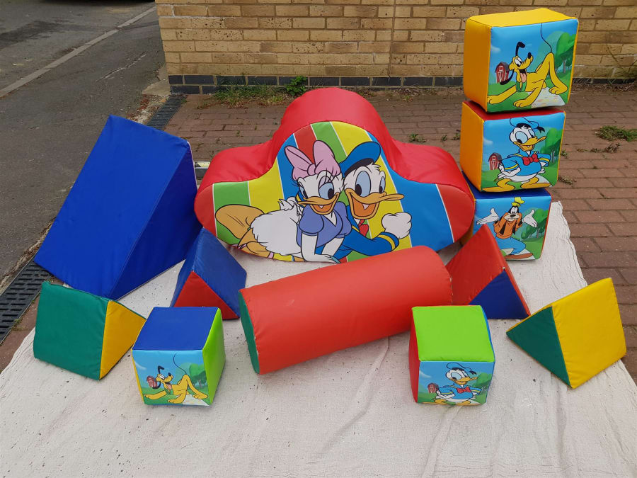 Bouncing Bonkers have this fantastic 12 pcs Soft Play set available for hire. 1 x Large Double Seesaw. 1 x large ultra Soft Blue Triangle. 1 x large Barrel. 4 x smaller Triangles. 3 x Large Cubes. 2 x Smaller Cubes. 1 x Multi coloured ball pool with steps and slide plus 300 soft play balls.